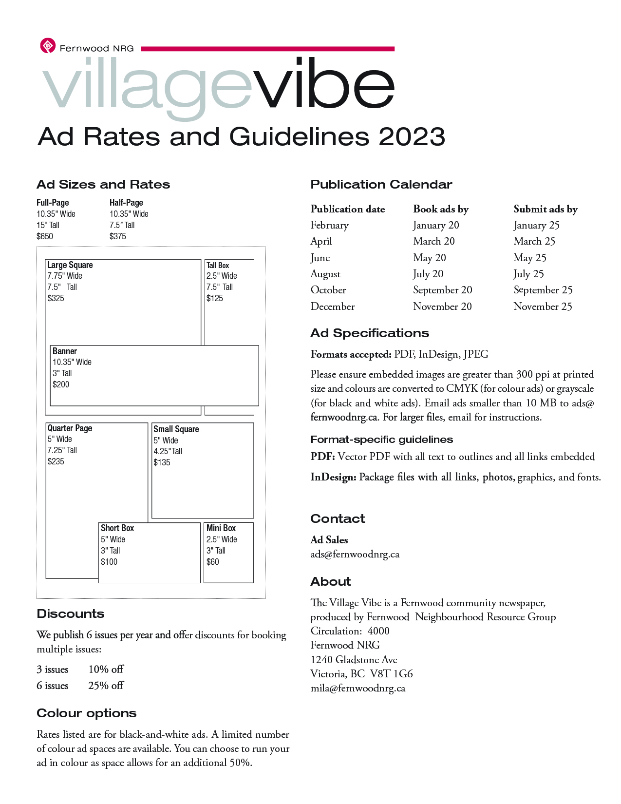 The Village Vibe is the perfect vehicle to promote a business or event to the neighbourhood of Fernwood. The paper is published bi-monthly, and has options to advertise in colour or black and white. 4000 copies are printed, and 3500 are distributed by mail to every household within walking distance of Fernwood Square, while 500 are distributed through local businesses and drop boxes in the neighbourhood.